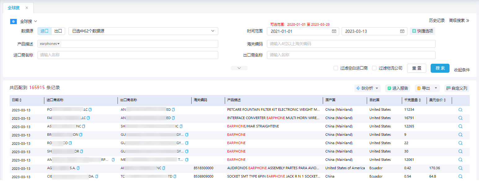 3. 结合该核心产品的特点从NO钱包官网外贸通中,找出采购earphones的买家及其交易记录,顺利获得分析采购动态、交易趋势、供应链,竞品特点等等,有针对性的去挖优质潜客 。
