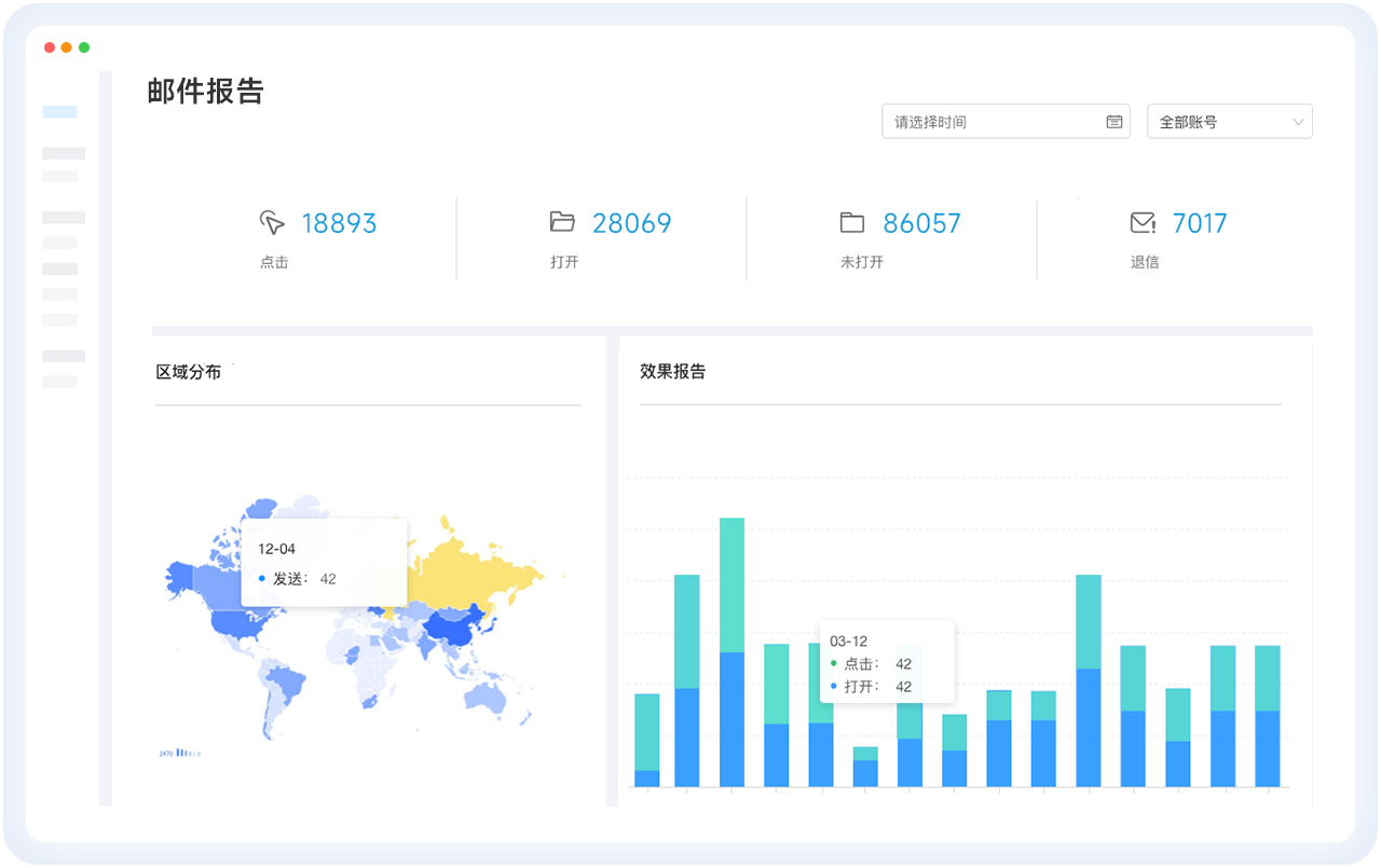行业独有,海外服务器+动态IP地址,90%高抵达率,内置多种国际化邮件营销模板,支持查看与分析打开率、点击率等数据,助力营销策略优化。