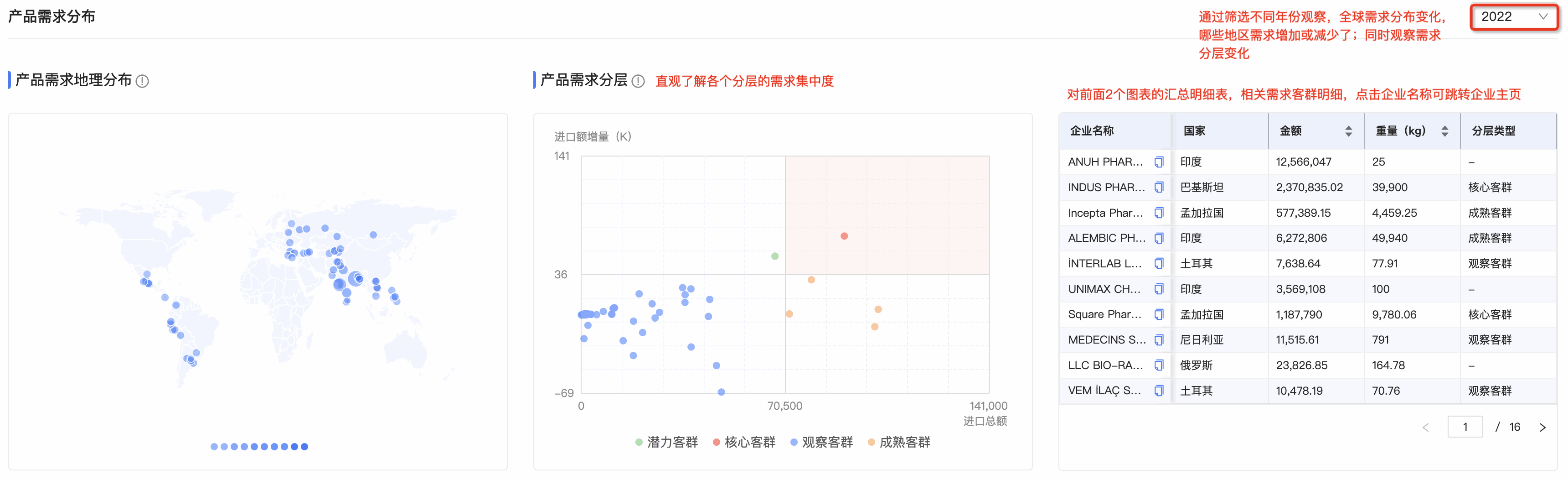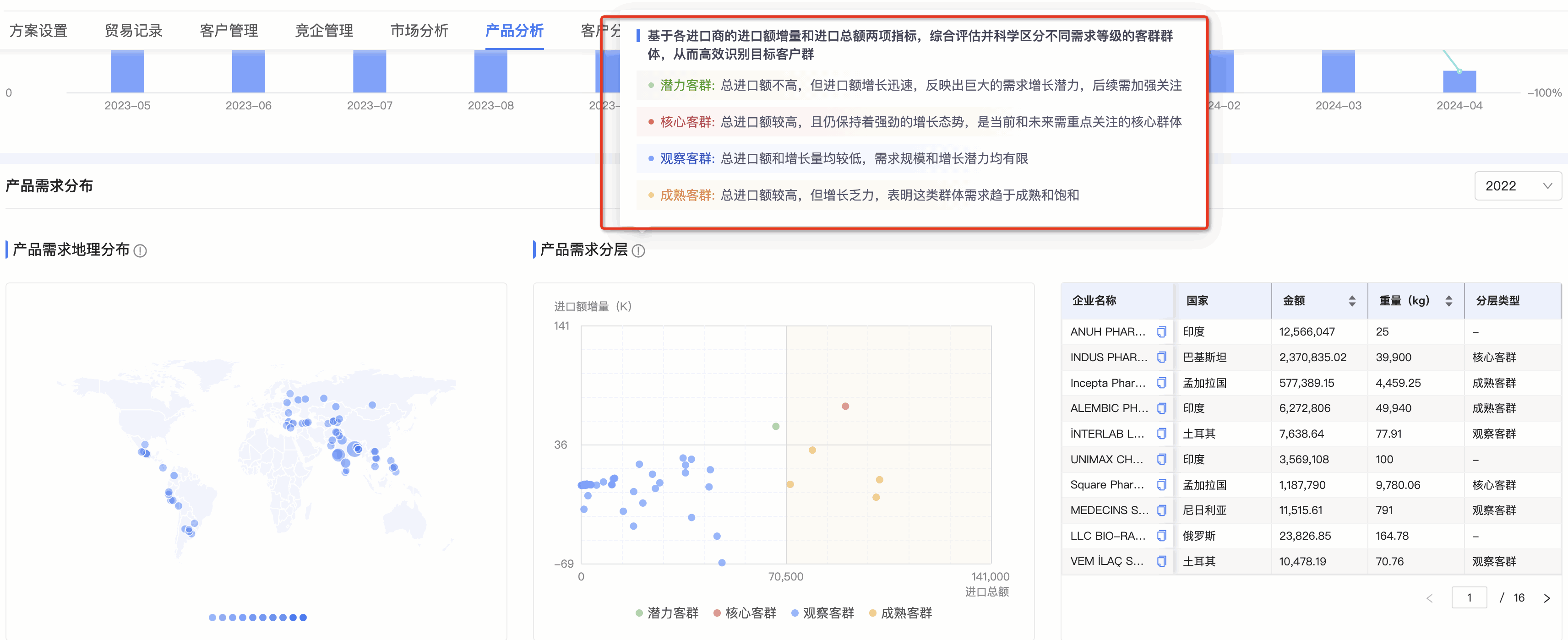● 产品需求分层图:NO钱包官网数据通将需求客群按照进口额增量和总额进行分层,划分为潜力、观察、成熟和核心四个层级。分层有助于用户快速锁定目标客户群体。标题旁附需求分层的解读,能让用户更直观、快速理解每个层级的特征,能够更快速的识别目标客群。